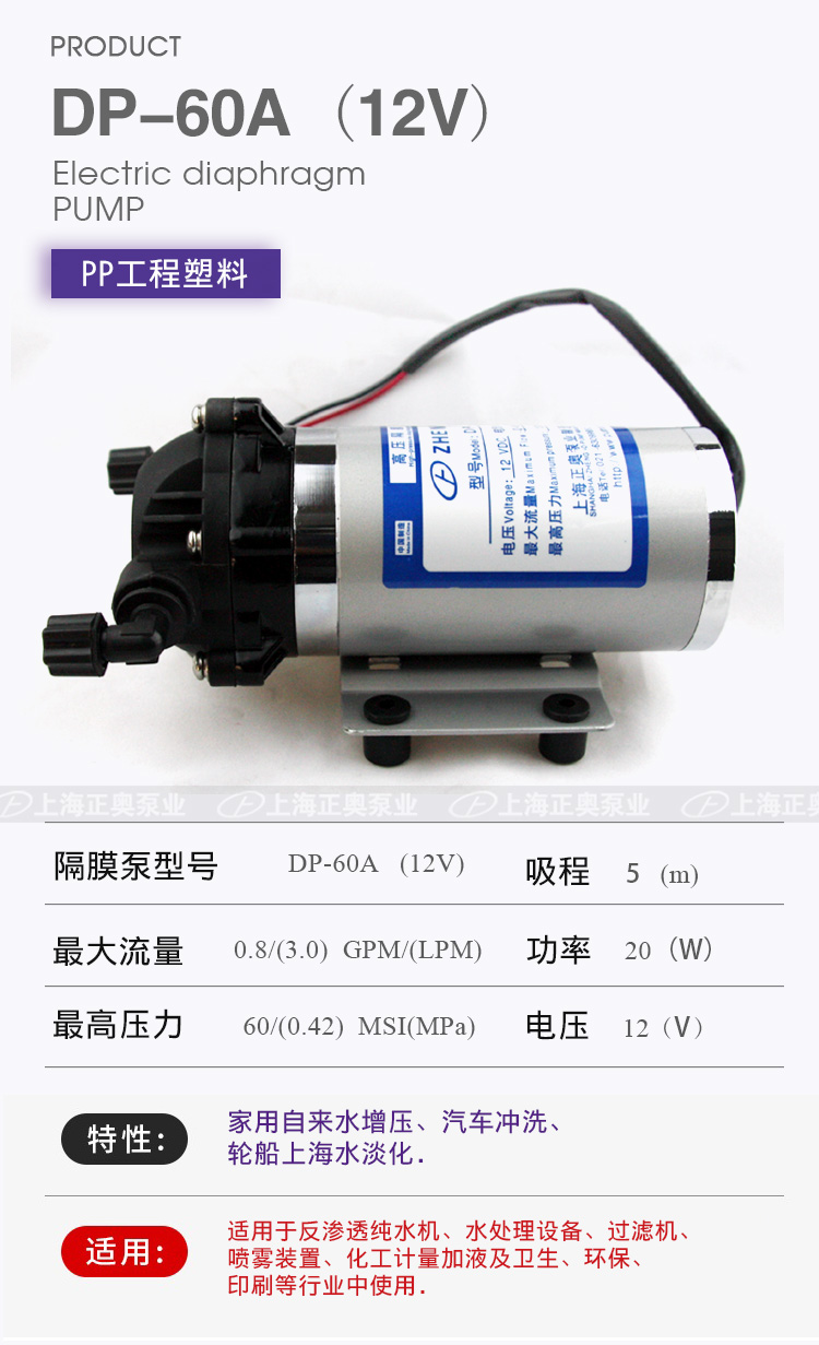DP微型電動(dòng)隔膜泵適用于家用自來(lái)水增壓、汽車沖洗、輪船上海水淡化,DP隔膜泵適用于反滲透純水機(jī)、水處理設(shè)備、過(guò)濾機(jī)、噴霧裝置、化工計(jì)量加液及衛(wèi)生、環(huán)保、印刷等行業(yè)中使用。