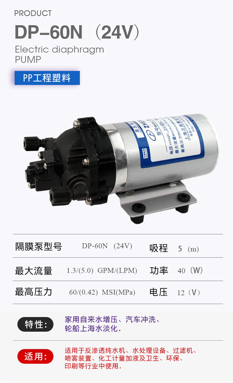 DP微型電動隔膜泵適用于家用自來水增壓、汽車沖洗、輪船上海水淡化,DP隔膜泵適用于反滲透純水機(jī)、水處理設(shè)備、過濾機(jī)、噴霧裝置、化工計量加液及衛(wèi)生、環(huán)保、印刷等行業(yè)中使用。
