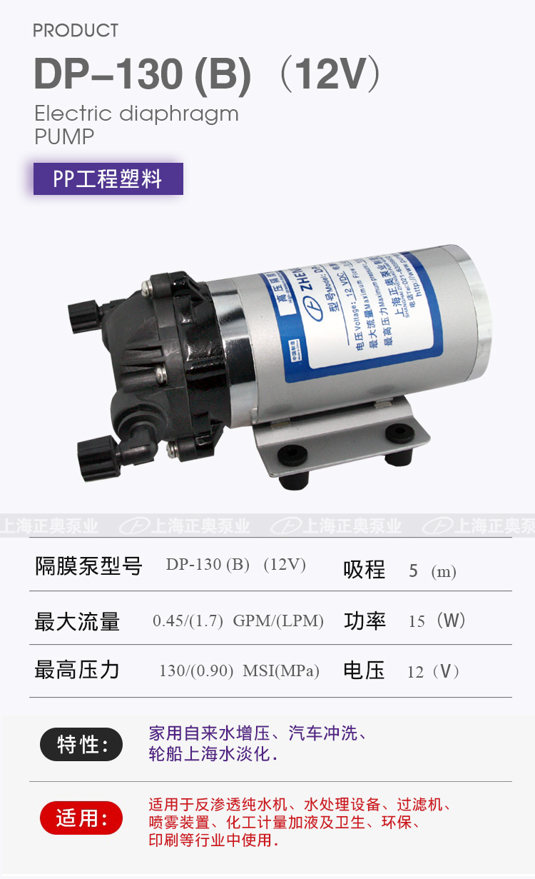 DP微型電動隔膜泵適用于家用自來水增壓、汽車沖洗、輪船上海水淡化,DP隔膜泵適用于反滲透純水機、水處理設(shè)備、過濾機、噴霧裝置、化工計量加液及衛(wèi)生、環(huán)保、印刷等行業(yè)中使用。
