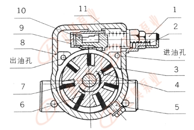 1、護罩    2、調(diào)節(jié)螺釘  3、葉  片    4、轉(zhuǎn)    子   5、螺堵  6、板彈簧   7、  軸    8、泵    體   9、閥  芯    10、閥    座   11、彈  簧