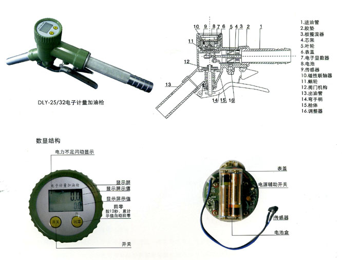 1、進(jìn)油管2、膠墊3、孔板整流器4、芯架5、葉輪6、表蓋7、電子顯數(shù)器8、電池9、傳感器10、磁性聯(lián)軸器11、蝸輪12、閥門機(jī)構(gòu)13、出油管14、彎手柄15、槍體16、調(diào)整器