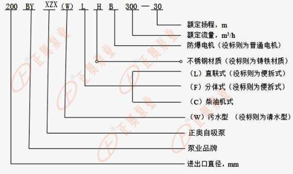 200-泵吸入口徑(mm) ZAZSW-正奧牌強(qiáng)自吸排污泵 (沒(méi)標(biāo)W則為清水型)L-直連式、F-分體式、C-柴油機(jī)式(沒(méi)標(biāo)則為便拆式)H-不銹鋼材質(zhì)(沒(méi)標(biāo)則為鑄鐵材質(zhì))B-防爆電機(jī)(沒(méi)標(biāo)則為普通電機(jī))300-額定流量(m3/h)30-額定揚(yáng)程(m)