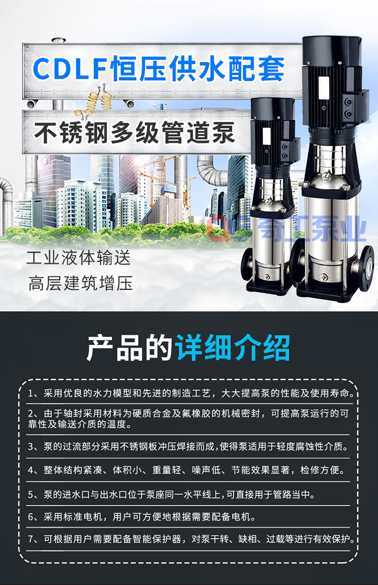 CDLF-1型不銹鋼立式多級泵(以下簡稱多級離心泵)是吸取了國內(nèi)外技術(shù)而設(shè)計制造的非自吸立式多級離心泵,采用標(biāo)準(zhǔn)立式電機(jī)和快裝式機(jī)械密封,更換非常方便。